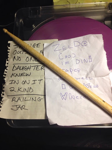 Here is a picture of the setlists and the drum stick I got from the concert on Sunday. The setlist on left is from the band Superheaven. They just recently changed there band name. They used to be called Daylight but had to change there name because of copyright reasons. They put on a pretty good set but the singer lost his voice so they did mostly instrumentals. It was pretty good for being all instrumentals though. The set list on the right is from the opening band called Ovlov. They were really good. Probably the second best set of the night after Basement. After the show was over I bought there album from there merch table. The band members were hanging out at the table and they were pretty cool.